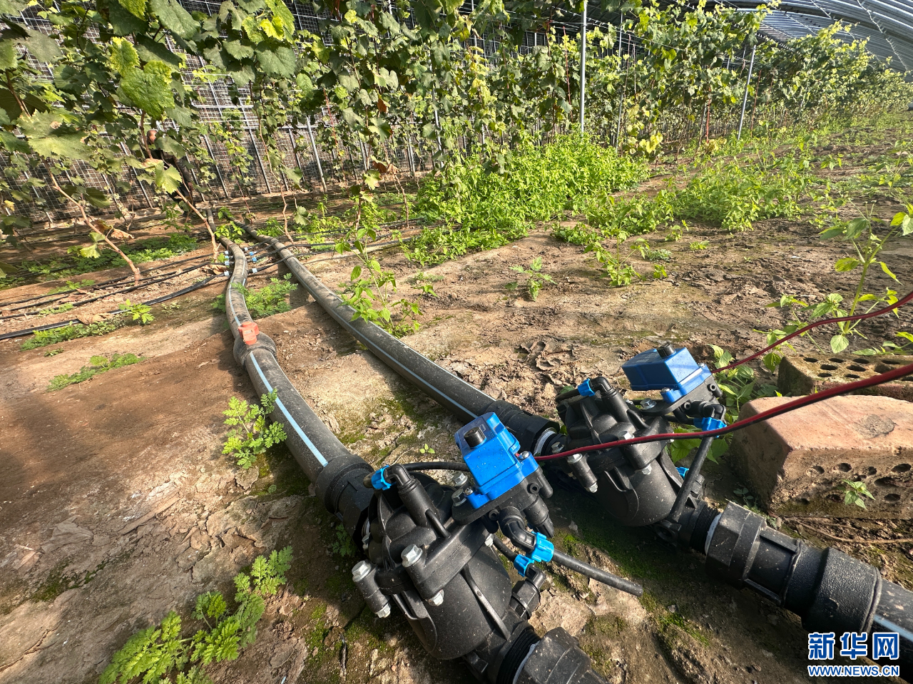 包头市东河区沙尔沁一村果路农业葡萄种植基地温室里,通过管道输送葡萄树苗所需营养成份。新华网发(张建芳 摄)