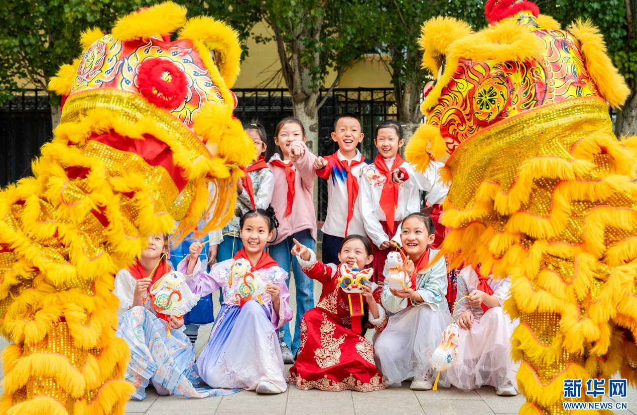 9月28日,呼和浩特市玉泉区清泉街小学表演舞狮的学生在中秋节主题活动上和同学们互动。新华网发(丁根厚 摄)