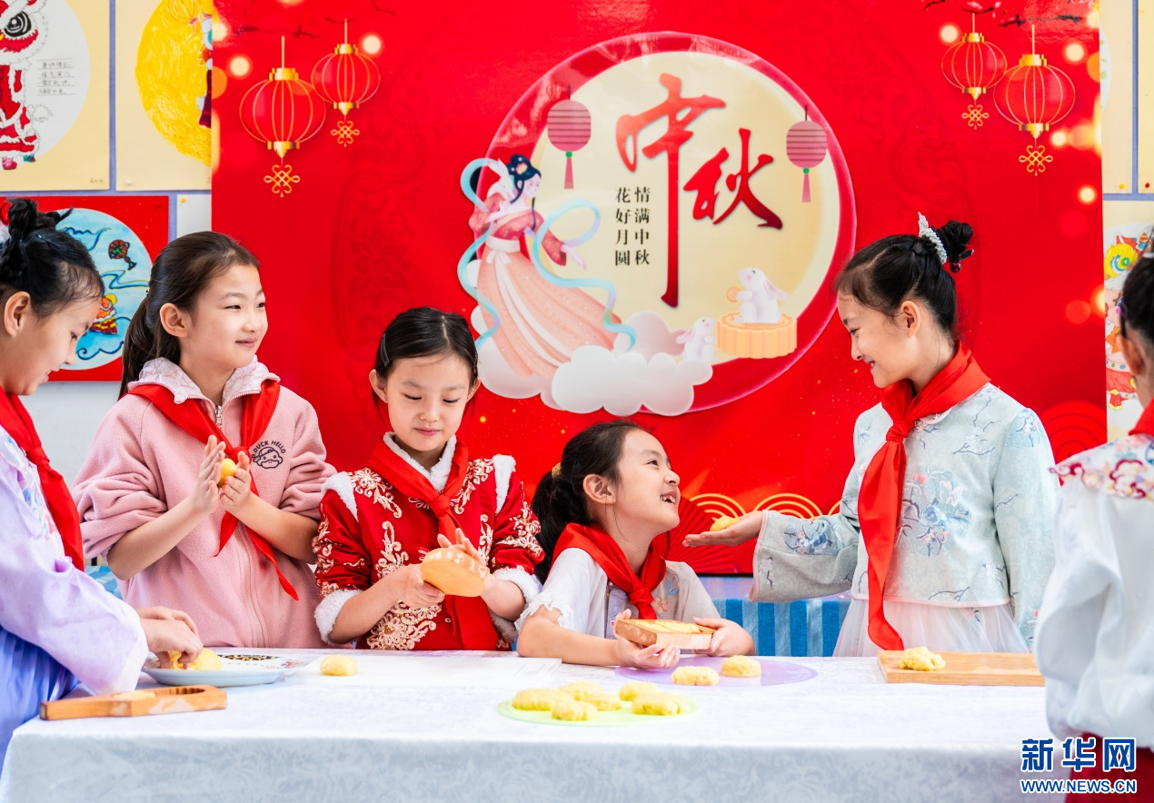 9月28日,呼和浩特市玉泉区清泉街小学学生在中秋节主题活动上学做月饼。新华网发(丁根厚 摄)