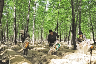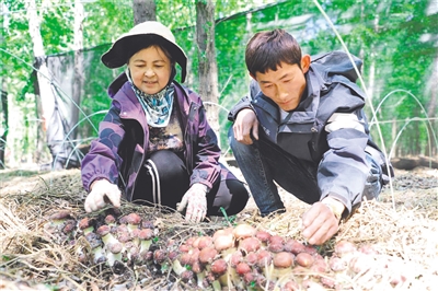 立夏刚过,兴安盟突泉县六户镇朵云山蘑菇庄园茂密的杨树林中,一簇簇赤松茸如雨后春笋般从“秸秆被”中探出红褐色的小脑袋。几名工人穿梭林间,忙着日常管护。