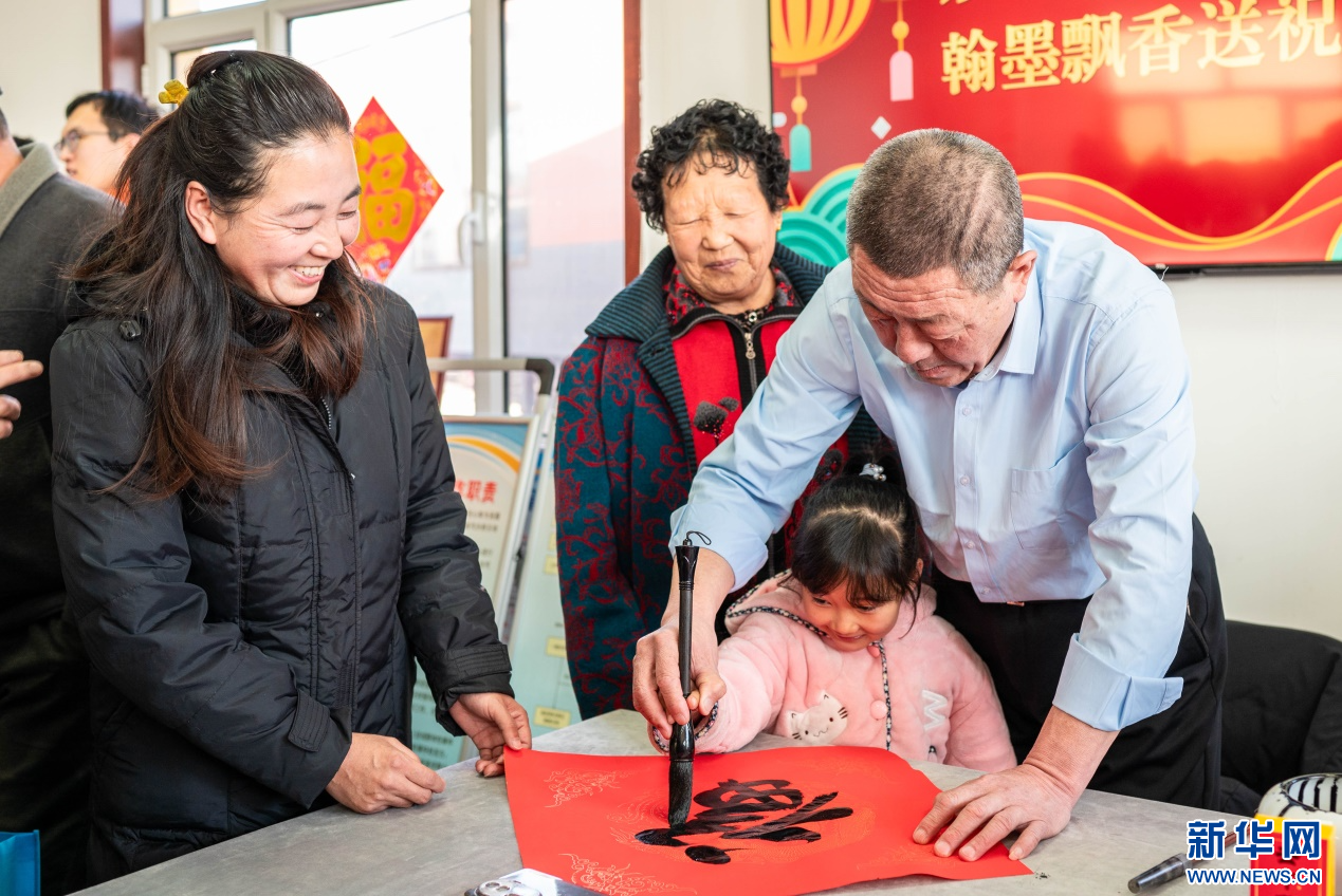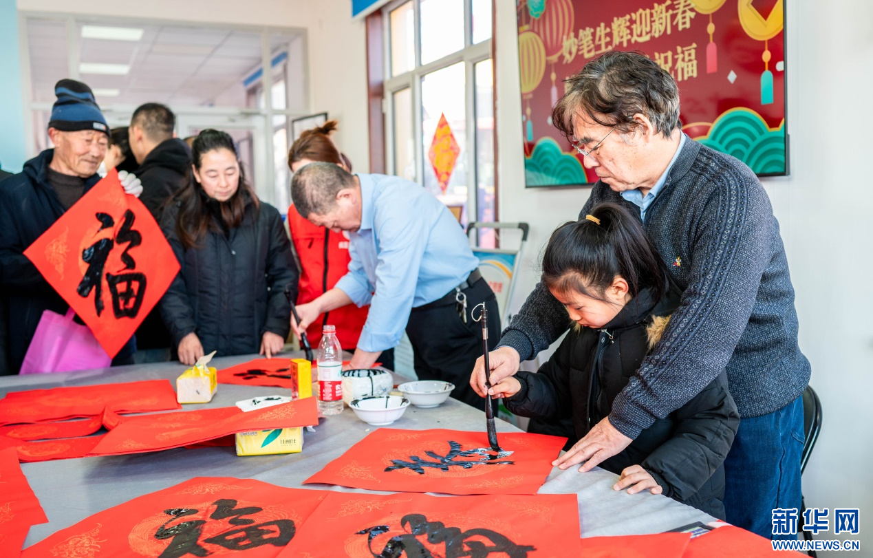 1月18日,志愿者在呼和浩特市玉泉区“三下乡”活动现场教小朋友书写“福”字。新华网发(丁根厚 摄)