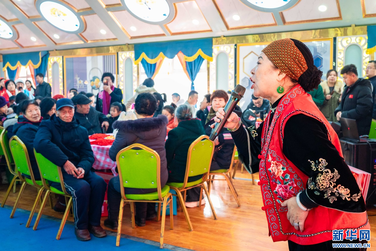 1月18日,前毛道村的文艺爱好者在呼和浩特市玉泉区“三下乡”活动现场表演歌伴舞《双脚踏上幸福路》。新华网发(丁根厚 摄)