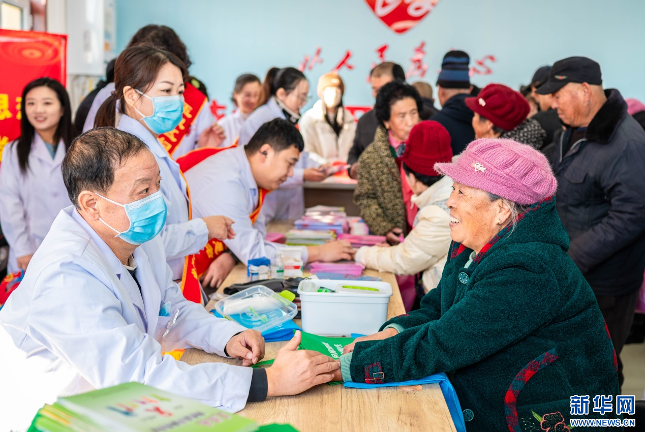 1月18日,医务工作者在呼和浩特市玉泉区“三下乡”活动现场为群众检查身体。新华网发(丁根厚 摄)
