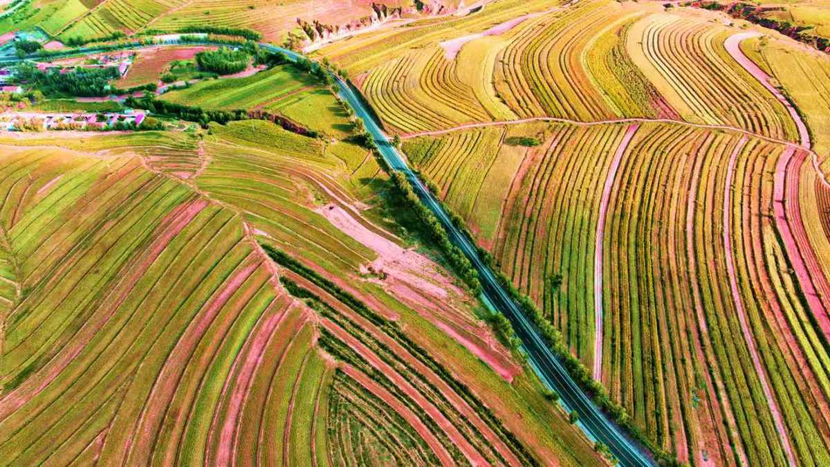 9月23日,翁牛特旗毛山东乡,成熟的荞麦在坡坡岭岭勾勒出丰收的图画。(李富 摄)