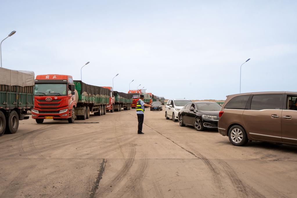 清晨,戈壁风沙裹着热浪扑面而来。当下正值旅游返程高峰,车辆一辆接一辆驶过,带起的尘灰与味道混杂在空气里。烈日炙烤下,执勤民警王鑫口罩紧扣,汗水顺着面颊滴落,仍忍不住打趣说:“这风裹着‘百味套餐’呢!”
