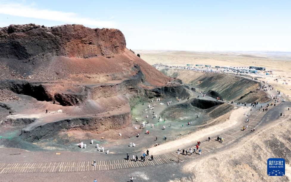 5月3日,游客在乌兰哈达火山群6号火山游玩(无人机照片)。新华社记者 马金瑞 摄
