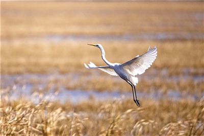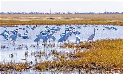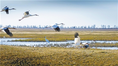 候鸟在湿地里觅食嬉戏、展翅盘旋。