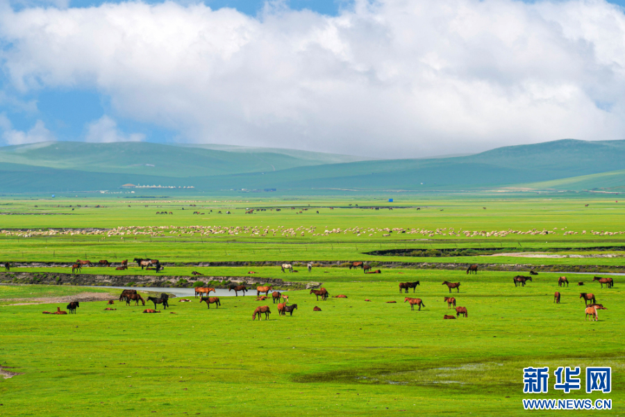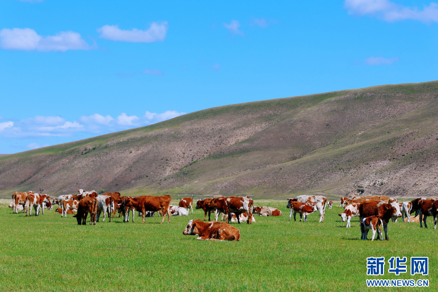 牛羊如珍珠洒落草原。新华网发(李永建 摄)